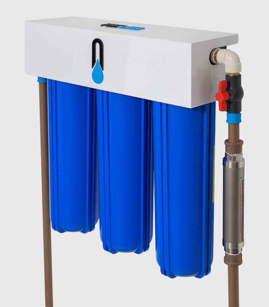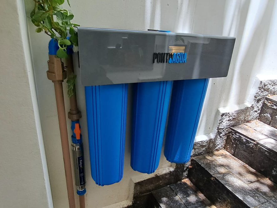 Equipamento de filtragem de alto fluxo, com três (3) estágios sequenciados de purificação, redução de excessos de cloro, elementos contaminantes, FÍSICOS e biológicos. Alta resistência e durabilidade. Segurança no uso da água em todos os pontos da casa.