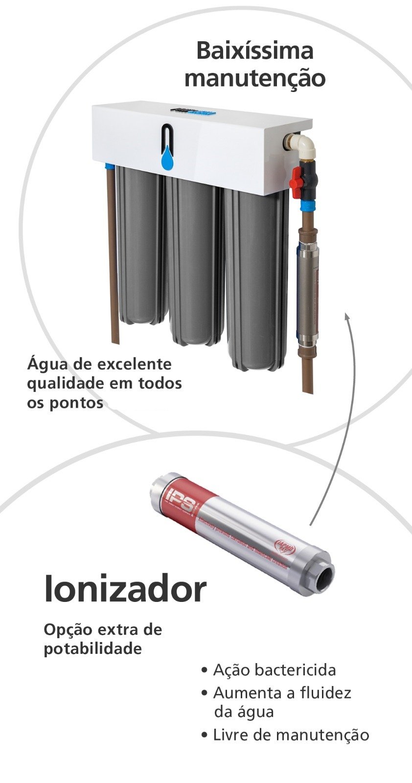 Filtragem central modular com ionização: água filtrada e ionizada em todos os pontos da casa.